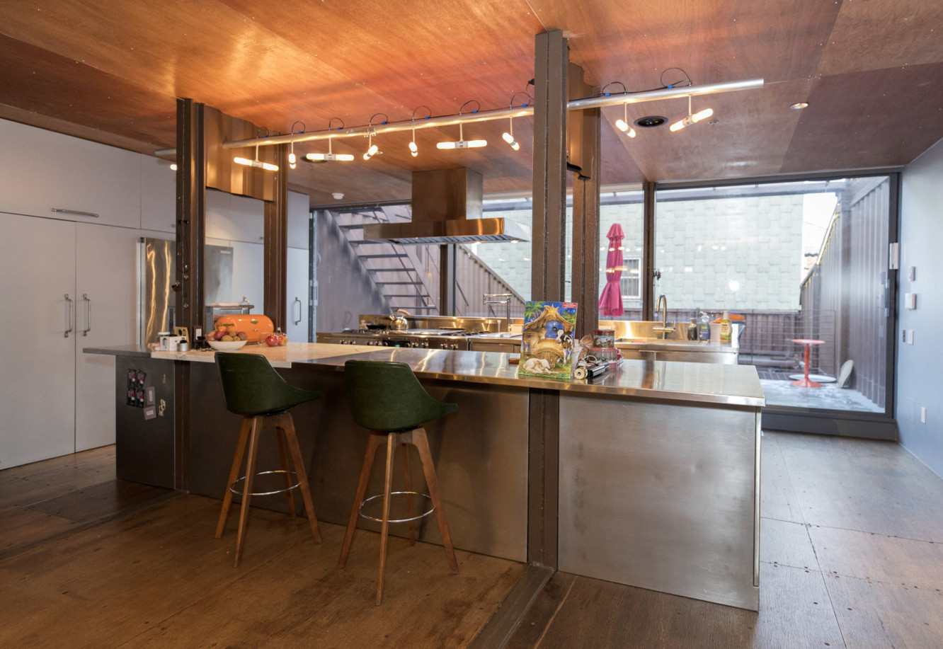 The wood floors are actually original. “People don’t realize shipping containers have hardwood floors,” Carroll says. “You can spill stuff on them, bang them up — and they still look great.”