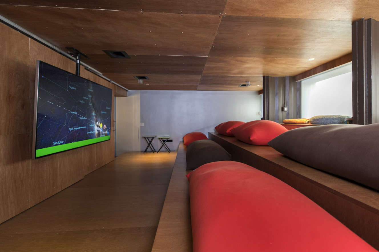 “Whenever I have Nerf gun fights, there’s a lot of places I can be a sniper from,” adds Dante, crawling into a gap above the mantel. Susannah, an enthusiastic gymnast, chimes in again: “I can do cartwheels and flips without hitting my foot on the wall.” The screening room and its tiered seating, padded with Yogibo beanbags, are a hit among the elementary-school set. “My friends were begging to see the house,” Susannah says. “After we moved in, we had a massive play date with my whole class.