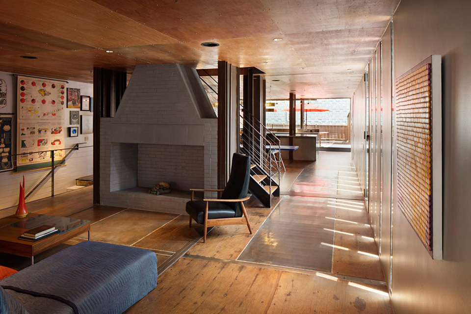 Tolle and Lignano tried to take advantage of having an entire side of the house open to the street while still ensuring the family’s privacy. LOT-EK only installed slender windows on that corrugated facade. (Carroll and Barbour later had them frosted to deter lookie-loos from peering into the intriguing building.)
