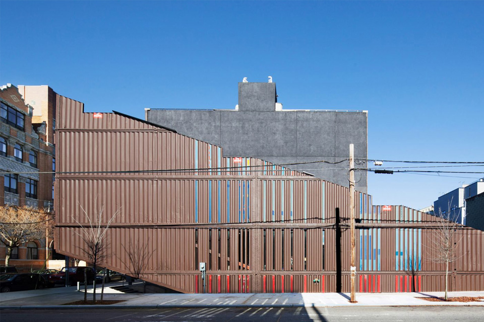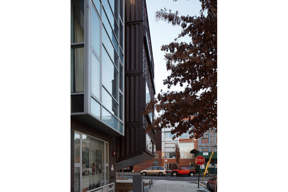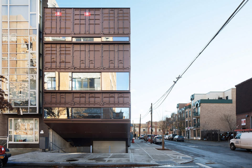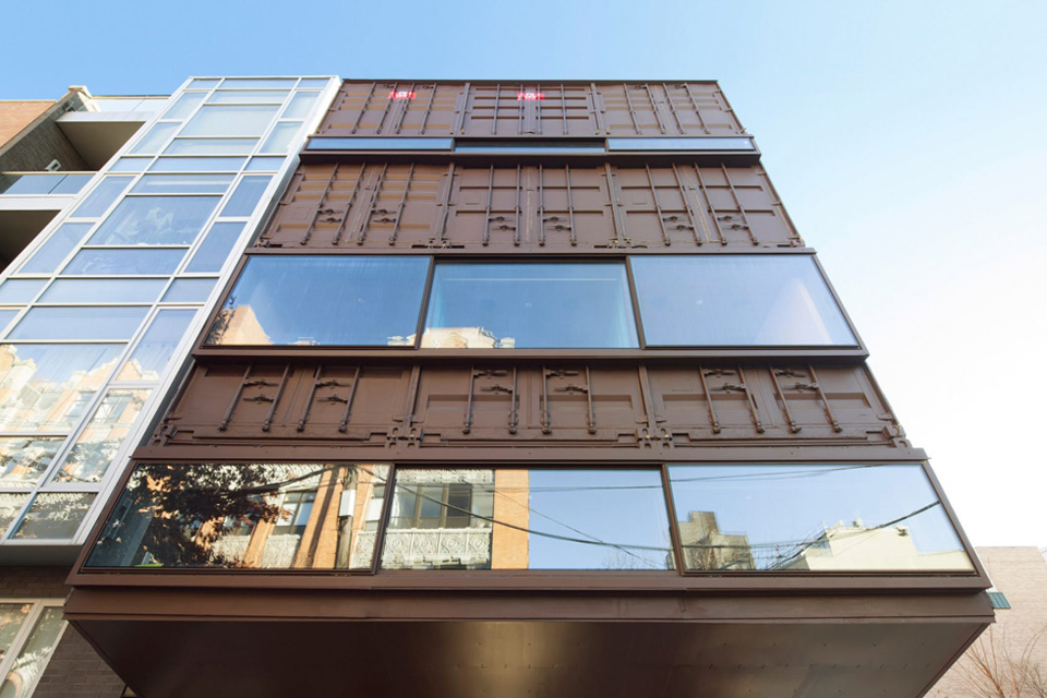 The architects intentionally left the nicks and dents acquired during the containers’ world travels. “Some of the scars of their previous history are very welcome,” Tolle says. “You see the different blues and red of the original containers [on the facade]. We wanted to leave those layers, but we painted some of it brown — a play on a brownstone.”