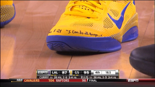 “It represents a Bible verse I wear on my shoe,” said Curry. “Philippians 4:13. It says ‘I can do all things through Christ who strengthens me.’ It’s also my mantra, how I get up for games and why I play the way I do.”
