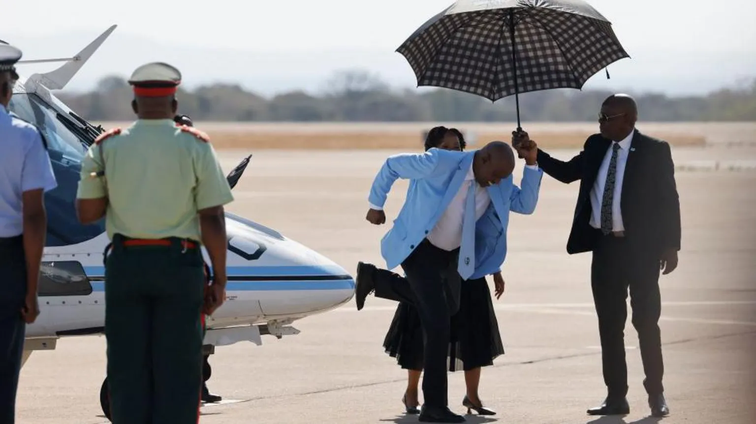 President Mokgweetsi Masisi exhibited some of his own moves, dancing on the tarmac as an aide held an umbrella to shelter him from the sun.