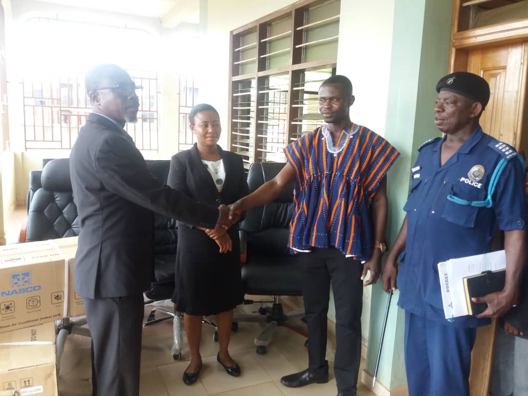 The items are 10 Office Executive leather chairs and 2 air conditioner units for the staff of the magistrate court. In attendance were the District Chief Executive, District Coordinating Director, Presiding Member, Staff of the court and the Media.