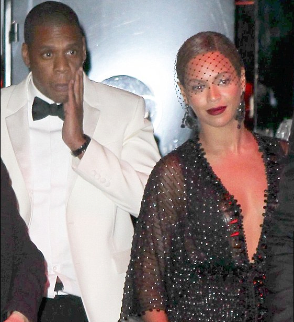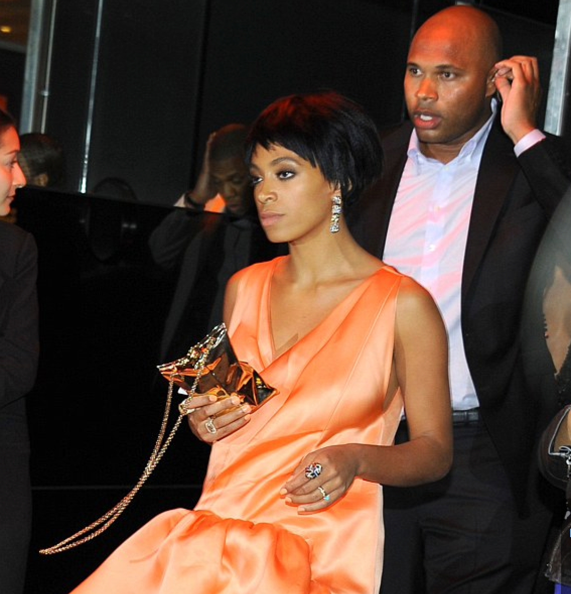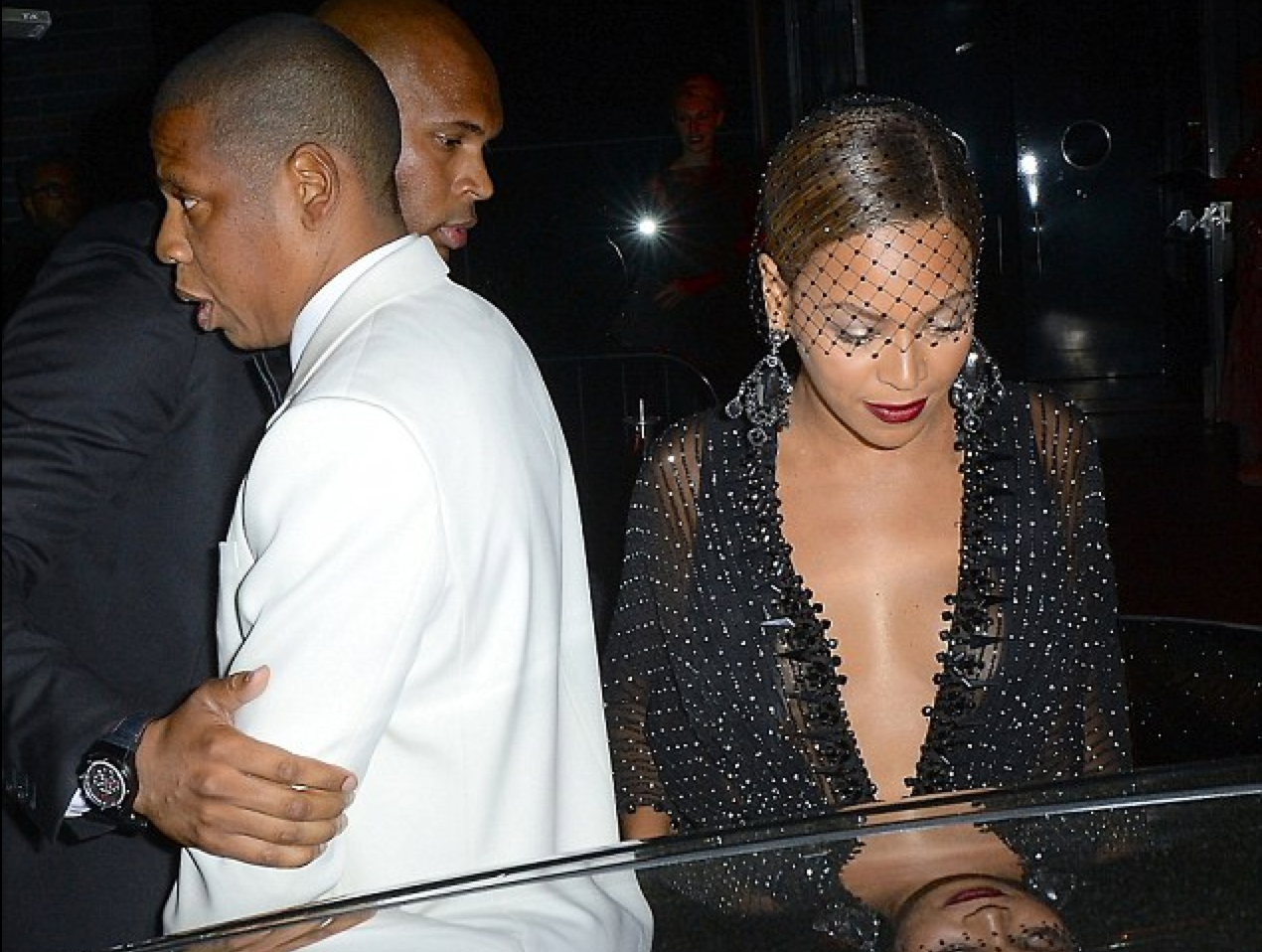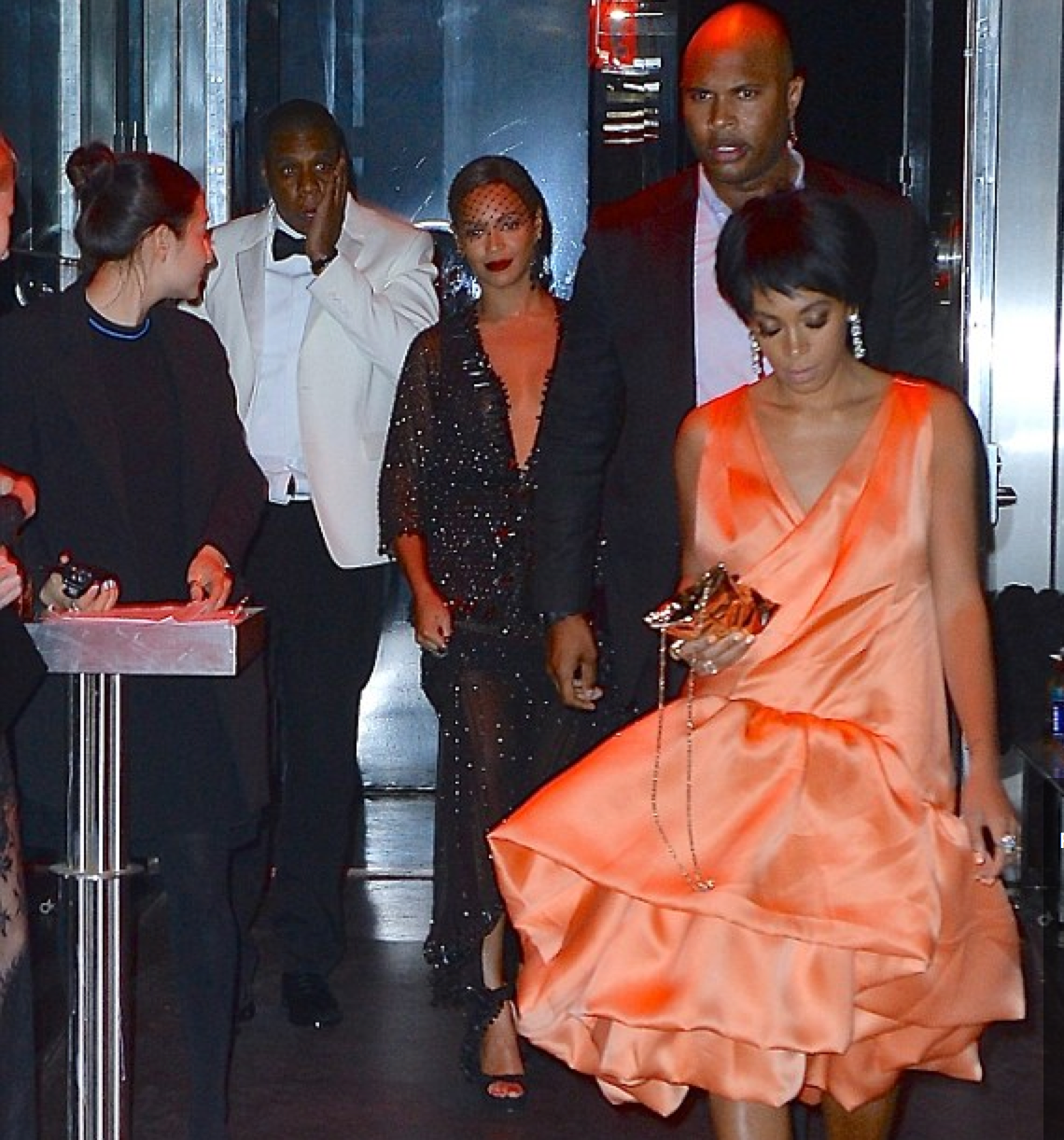 - Jay Z being assisted away by bodyguard. Beyonce leaves separately with Solange