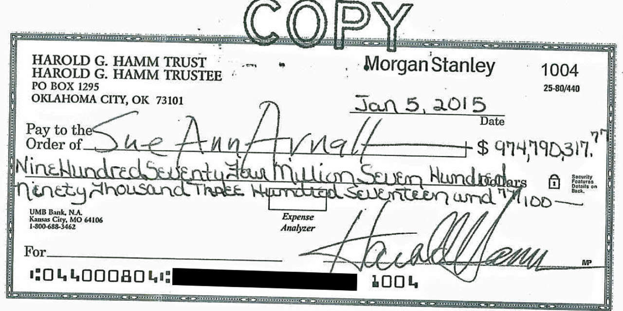 Hamm, who Bloomberg estimates is currently worth $8.7 billion (after being worth as much as $18 billion), sent the handwritten check to the legal team of ex-wife Sue Ann Arnall to cover the full cash value of what he owes based on a November divorce ruling by an Oklahoma County judge.